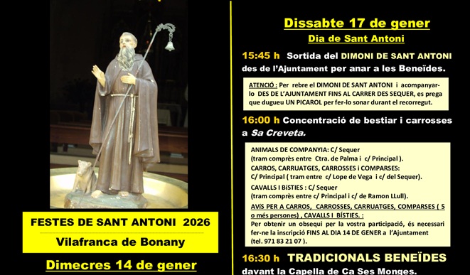 Amb un programa d'activitats del dia 14 al dia 23 de gener, Vilafranca es prepara per viure la FESTA DE SANT ANTONI amb l'esperit festiu propi d'aquests dies, especialment el dia 16 de gener, DIA DE LA REVETLLA, en què es hi haurà el FOGUERÓ I TORRADA GRATUÏTA per a tothom organitzada per l'Ajuntament a la Plaça Major i, l'endemà, dia 17 de gener, el DIA DE SANT ANTONI, les TRADICIONALS BENEÏDES a la Capella de Ca Ses Monges.